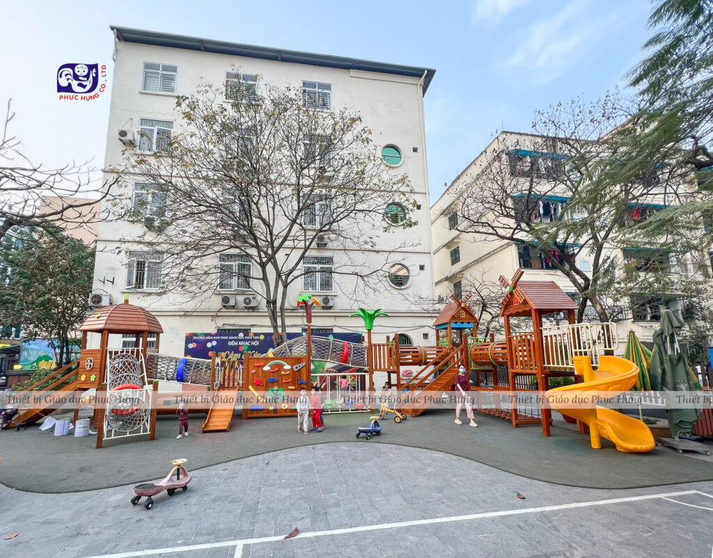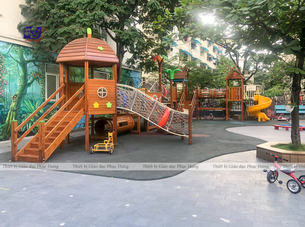 Các khu vui chơi trong trường thường được thiết kế an toàn, phù hợp với từng độ tuổi và đảm bảo tiêu chuẩn giáo dục.