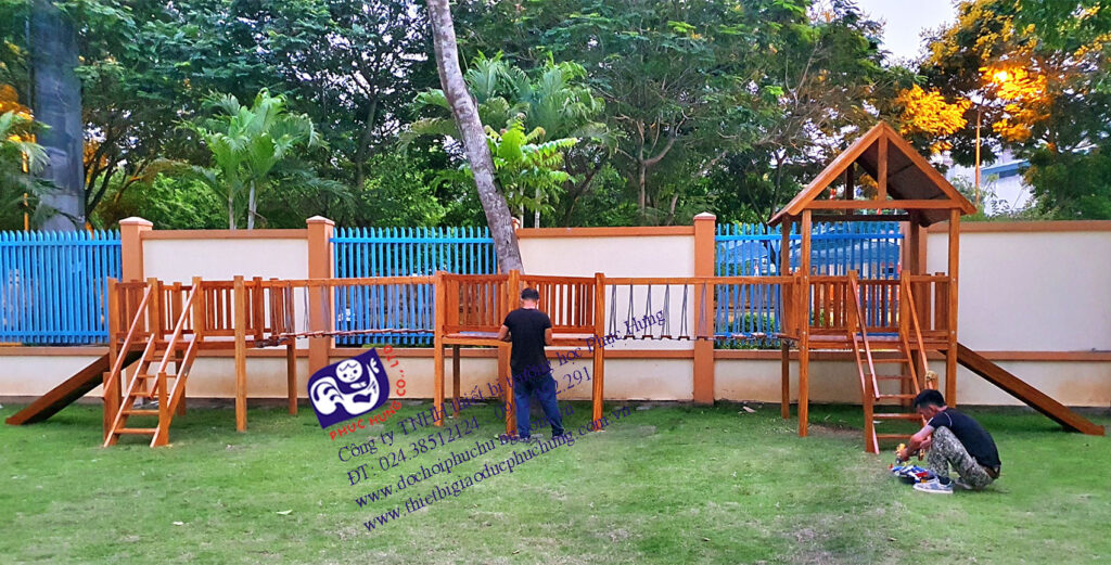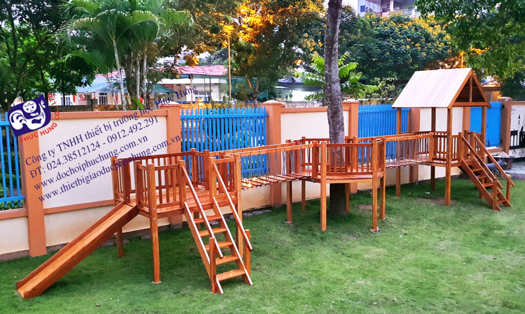 Quy cách: Nhà chơi liên hoàn cầu trượt làm bằng chất liệu gỗ gồm: 01 khối nhà có mái, 01 khối nhà không mái, 01 khối hình lục giá, 02 cầu nối thang dây có các bậc bằng gỗ . 02 cầu trượt thẳng, 02 thang leo. lan can bảo vệ.